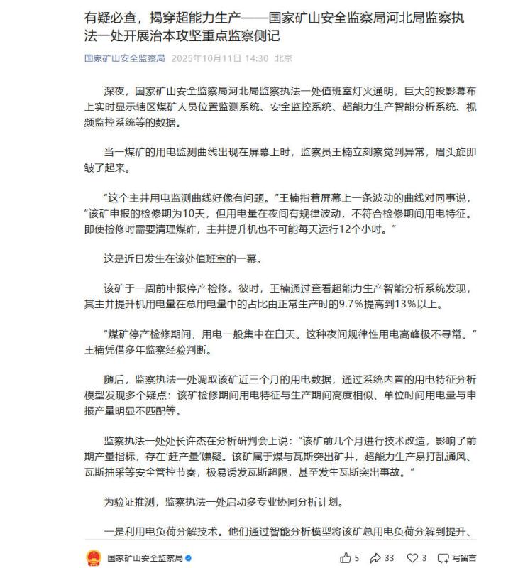 “煤矿停产检修期间,用电一般集中在白天。这种夜间规律性用电高峰极不寻常。”王楠凭借多年监察经验判断。